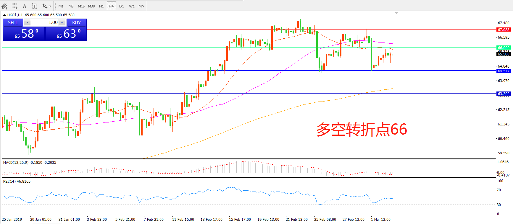 交易策略:在66.00之下看跌,目标64.50   63.00