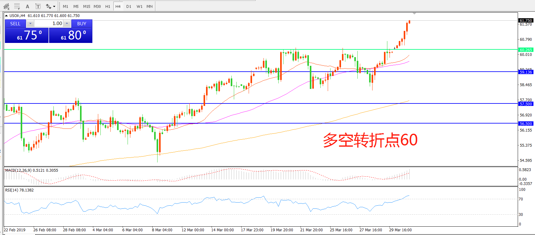 外媒周一(4月1日)发布原油产量调查报告显示,3月石油输出国组织(OPEC)原油产量料将连续第四个月下滑,因沙特继续压低产量,从而帮助原油市场重归均衡,同时委内瑞拉金融危机加剧导致该国产量大降。国际油价周一(4月1日)盘中强势上涨逾2%。在连续三个月收缩后,3月中国制造业活动扩张幅度终于强于预期,这令市场对经济放缓忧虑有所缓解。美国WTI原油最终周一(4月1日)收涨1.40 美元,报64.75美元/桶。