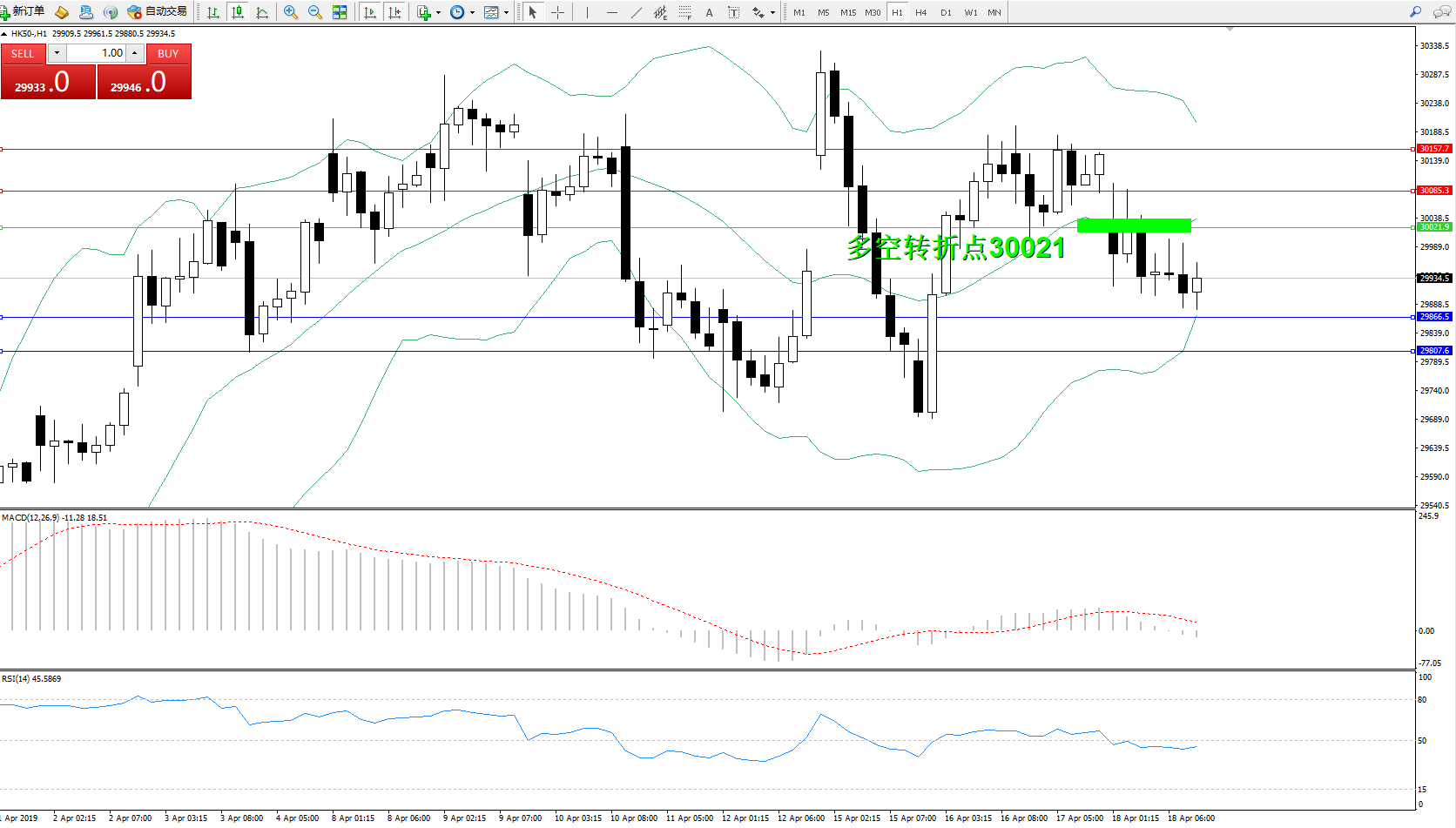 港股早上低开,曾收窄至仅跌22点。唯沽盘涌现,再扩大跌幅,穿30000关口,低见29927,最多跌196点。香港恒生指数收盘跌0.5%至29963.26点。美联储昨日公布褐皮书认为就业市场较为良好,市场对此解读不一,美股医药及制造业板块走弱拖累美三大股指收跌。现外围美股收跌令港股缺乏方向,同时美联储褐皮书的对就业说法令投资者认为偏鹰派,恒指走软。耶稣受难日,美国、澳大利亚、中国香港、欧洲多国(德英法西意等)交易所休市一日。
