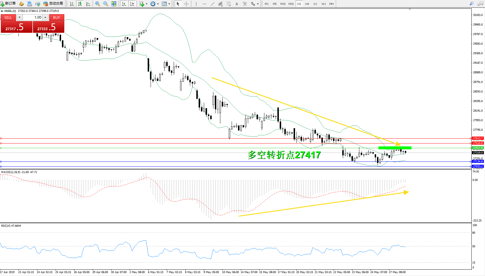 技术点评:空头持续弱势整理下行中,跌势虽有减弱,但反转动力并不强劲,K线与MACD指标仍处于背离走势,有回升至0轴线态势,MACD指标50均衡线持续震荡;