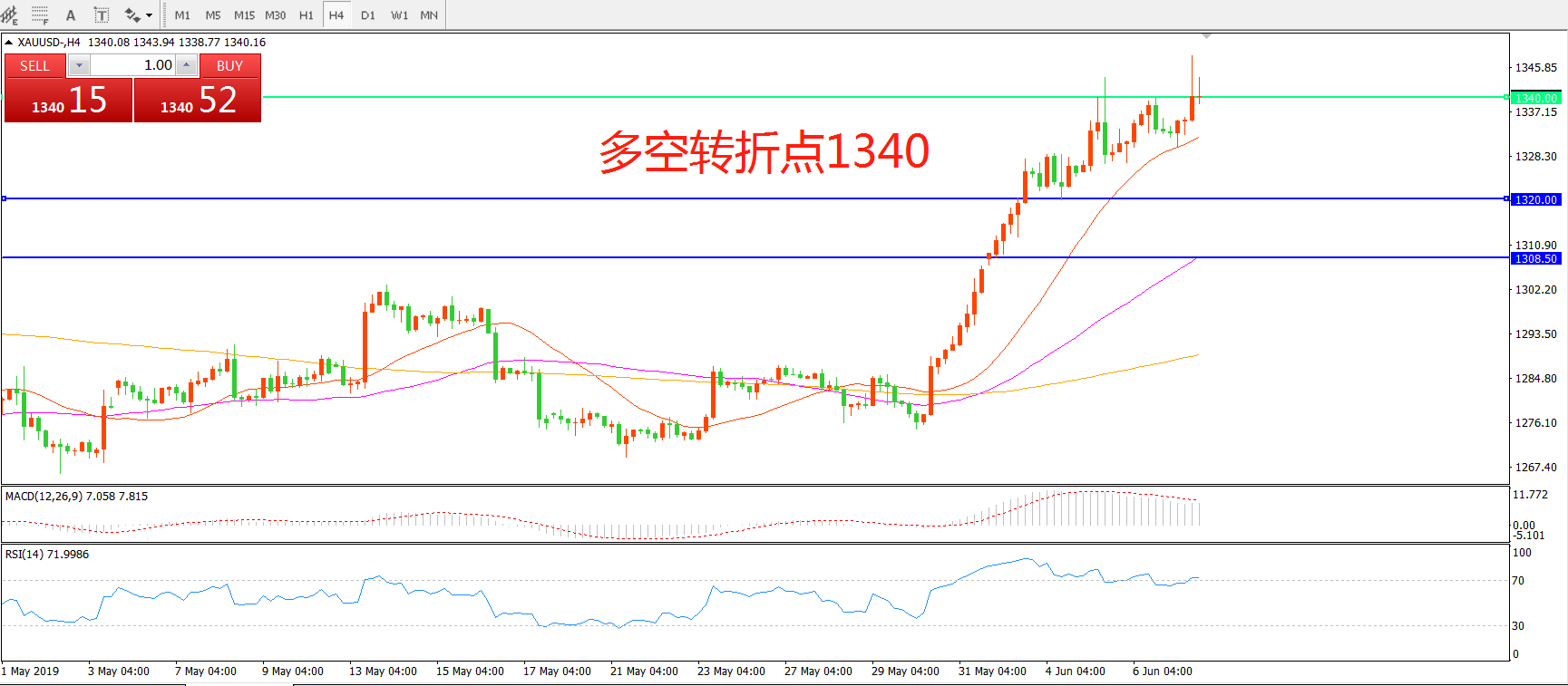 4小时图看,金价两次触碰1340阻力后回落,确认上方阻力有效,均线系统呈多头排列,MACD红柱减少,RSI指标走平,短期以多头思路对待,重点关注上方1340附近阻力。