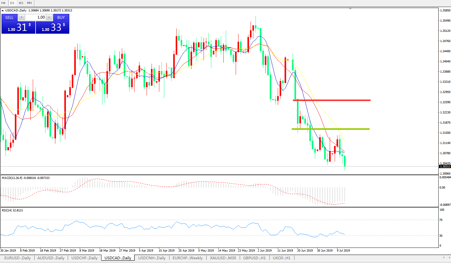 技术面简析:日线图均线仍呈有序空头排列,价格昨日再破前低逼近1.30关口,MACD在0轴下方运行且动能柱有再度放量迹象,RSI反弹乏力再度下行,预计短线汇价或将继续疲弱,重点关注1.30关口支撑是否有效。