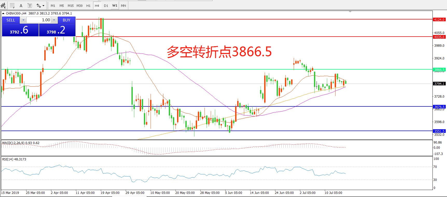 4小时图看,沪深300指数以200周期均线为支撑一度冲高,小幅回落后延续震荡,MACD红柱缩短,RSI指标走平,日内震荡概率较大。