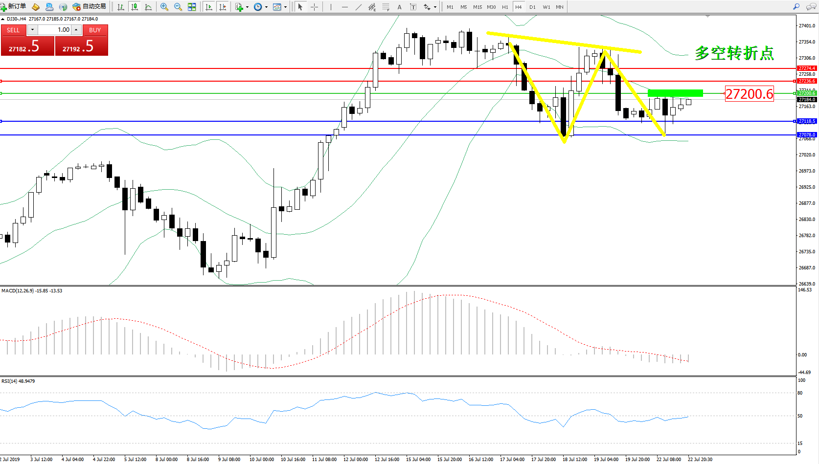 道琼斯指数7月22日(周一)收盘上涨17.70点,涨幅0.07%,报27171.90点。鉴于目前的贸易疑虑有所降温,股票市场看起来仍然很有吸引力,因为美国地质勘探局国债收益率下降,稳定的公司债券市场增强了对企业盈利前景的信心。美国国会和白宫将就上调债务上限一事达成协议,根据该协议,上调后的债务上限有效期将持续至2021年7月。目前协商的关键在于,是否将特朗普政府减少1500亿美元开支加入协议中。如果预算谈判无法在期限内结束,议员们可能会决定延长债务上限至10月,这虽然会避免政府违约,但同时也会增加市场不确定性。