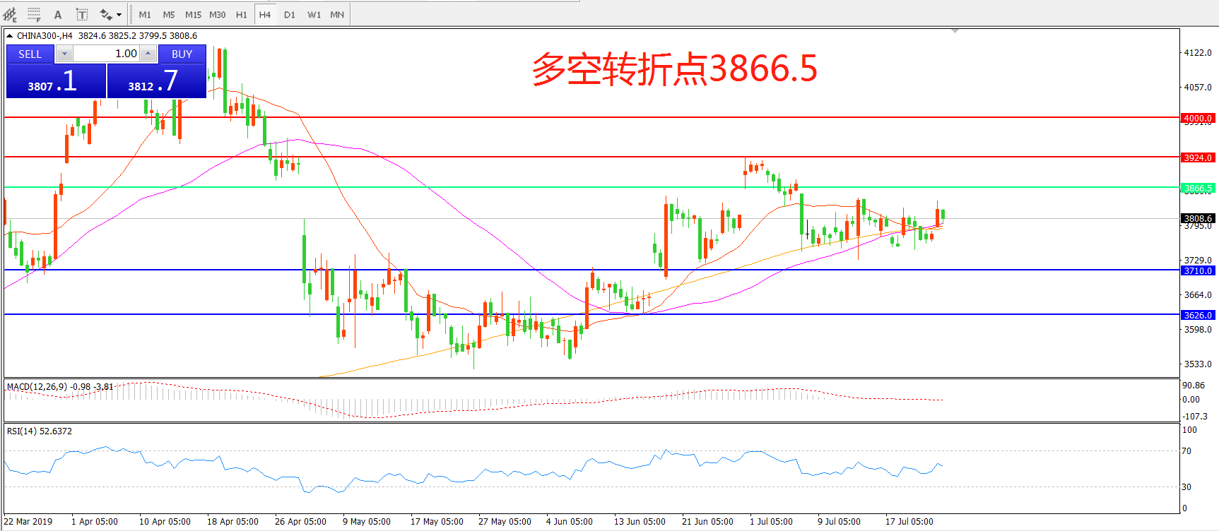 4小时图看,沪深300指数延续震荡,均线系统粘合形成支撑,MACD红柱缩短,RSI指标走平,日内震荡下行概率较大。