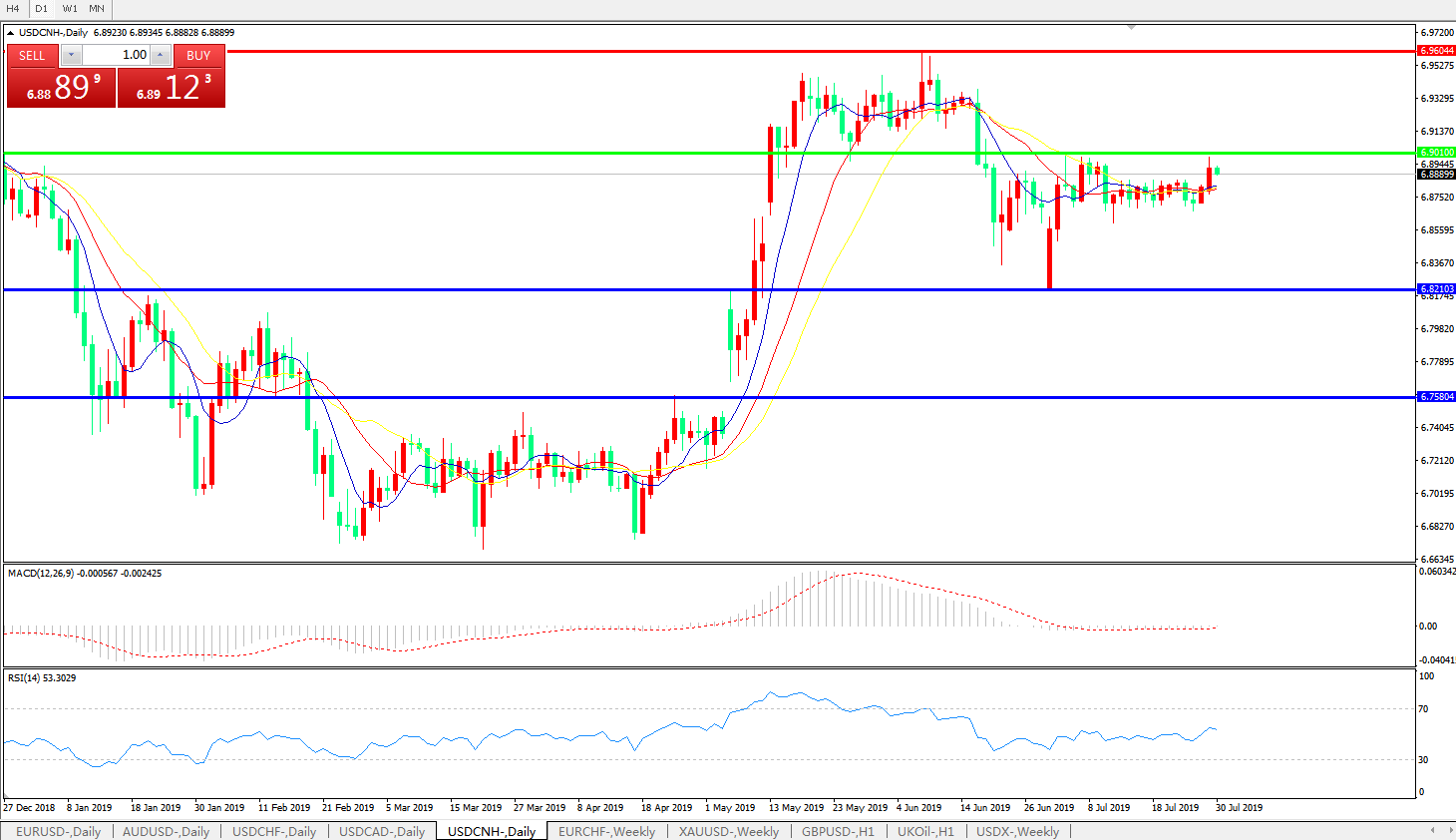 交易策略: 在6.9010之下,看跌,目标价位为6.8210,然后为6.7580。