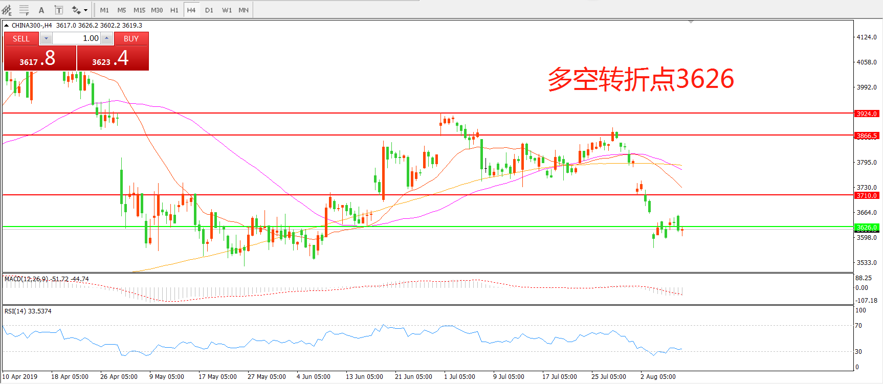 4小时图看,沪深300指数震荡走低 ,整体表现依然偏弱,均线系统有拐头迹象,MACD绿柱增加,RSI走平,日内延续下行概率较大