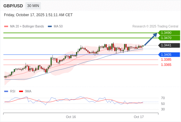 在 1.3405 之上,看涨,目标价位为 1.3470 ,然后为 1.3490 。