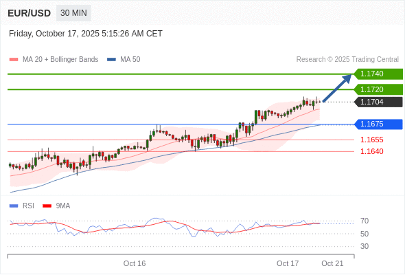 在 1.1675 之上,看涨,目标价位为 1.1720 ,然后为 1.1740 。