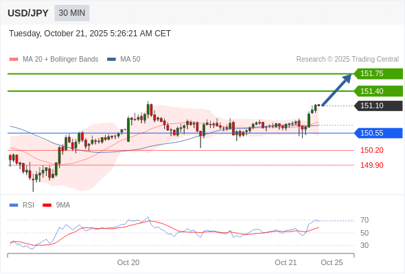 在 150.55 之上,看涨,目标价位为 151.40 ,然后为 151.75 。