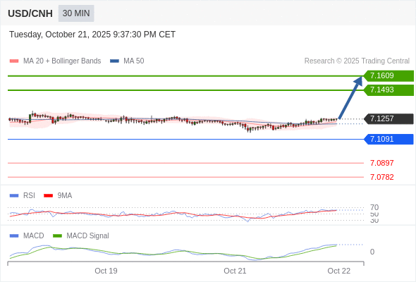 技术点评 : RSI技术指标超过50。 MACD技术指标处在其信号线之上 看多。 此外,价位高于其20天及50天移动平均线 ( 分别位于 7.1235 和 7.1217 )。