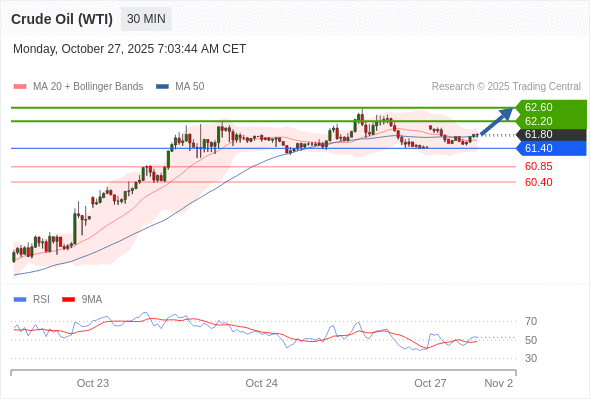 在 61.40 之上,看涨,目标价位为 62.20 ,然后为 62.60 。