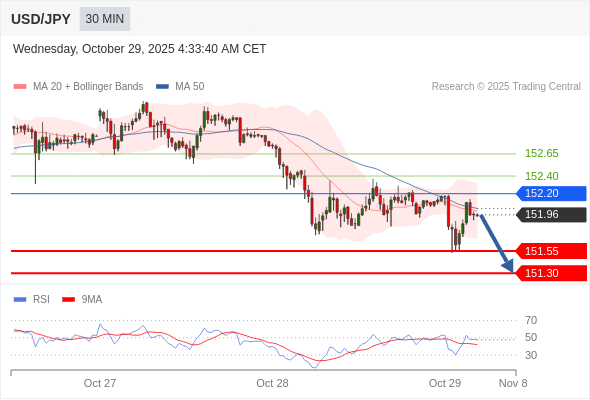 在 152.20 之下,看跌,目标价位为 151.55 ,然后为 151.30 。
