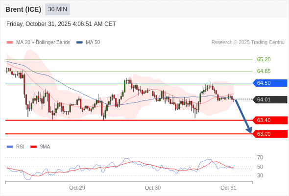 交易策略: 在 64.50 之下,看跌,目标价位为 63.40 ,然后为 63.00 。