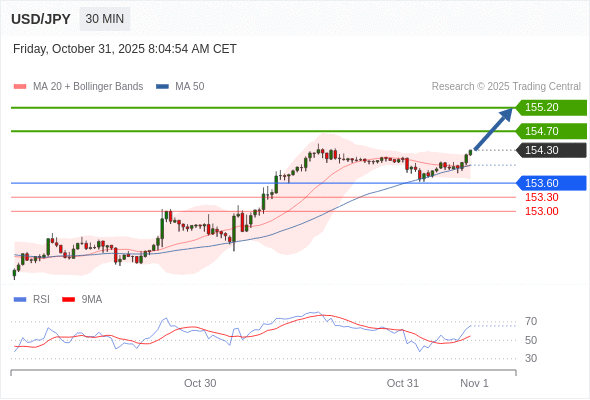 在 153.60 之上,看涨,目标价位为 154.70 ,然后为 155.20 。
