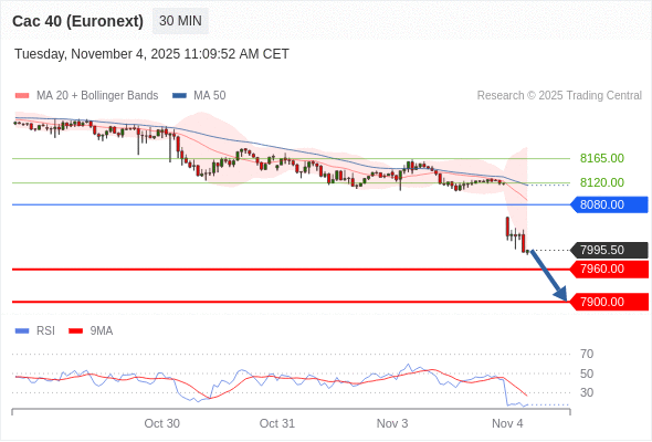 法国CAC指数期货 (Euronext) (X5) 当日内: 下跌趋势。