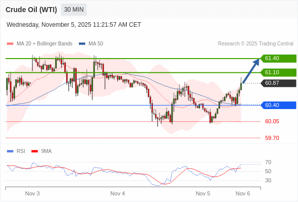在 60.40 之上,看涨,目标价位为 61.10 ,然后为 61.40 。