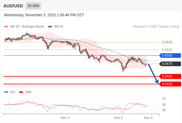 在 0.6500 之下,看跌,目标价位为 0.6445 ,然后为 0.6425 。
