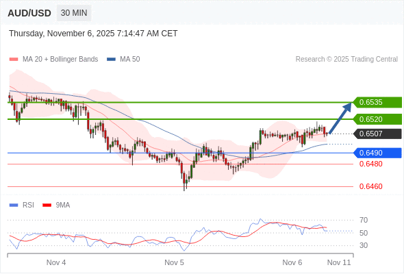 在 0.6490 之上,看涨,目标价位为 0.6520 ,然后为 0.6535 。