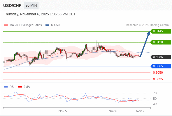 在 0.8065 之上,看涨,目标价位为 0.8120 ,然后为 0.8145 。