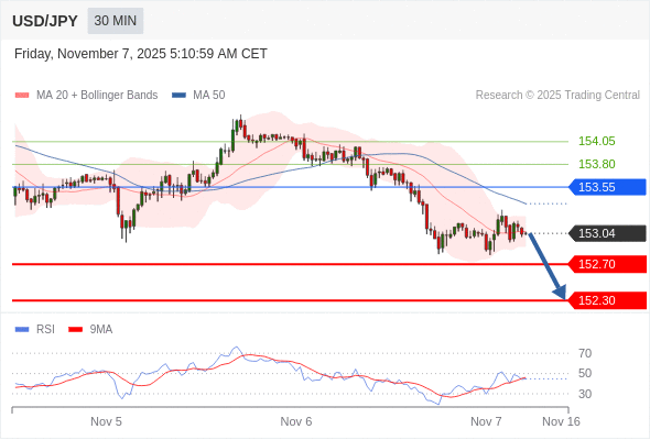 在 153.55 之下,看跌,目标价位为 152.70 ,然后为 152.30 。
