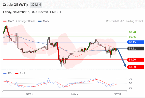 在 60.15 之下,看跌,目标价位为 59.20 ,然后为 58.80 。