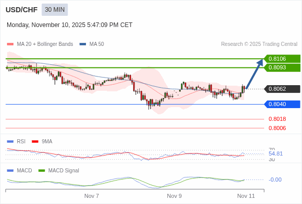 美元/瑞郎 当日内 : 看涨,当 0.8040 未被跌破。