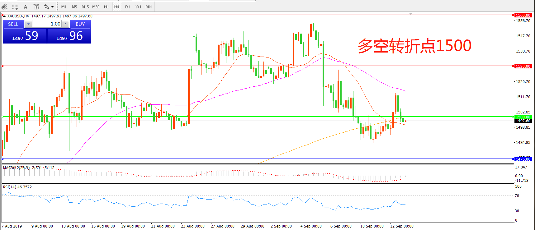 受到欧洲央行宽松举措以及中美贸易方面的消息的影响,金融市场短线剧烈波动, 根据央视新闻报道,在商务部举行的例行新闻发布会上,针对美方宣布将推迟加征中国关税的问题,中方对美方释放的善意的行动表示欢迎,中美关系回暖的迹象缓解了市场中的避险情绪,而欧洲央行则火力全开,宣布降息的同时启其量化宽松,央行的宽松政策为金价提供了有力支撑,金价宽幅震荡后最终收报1497.75美元/盎司。