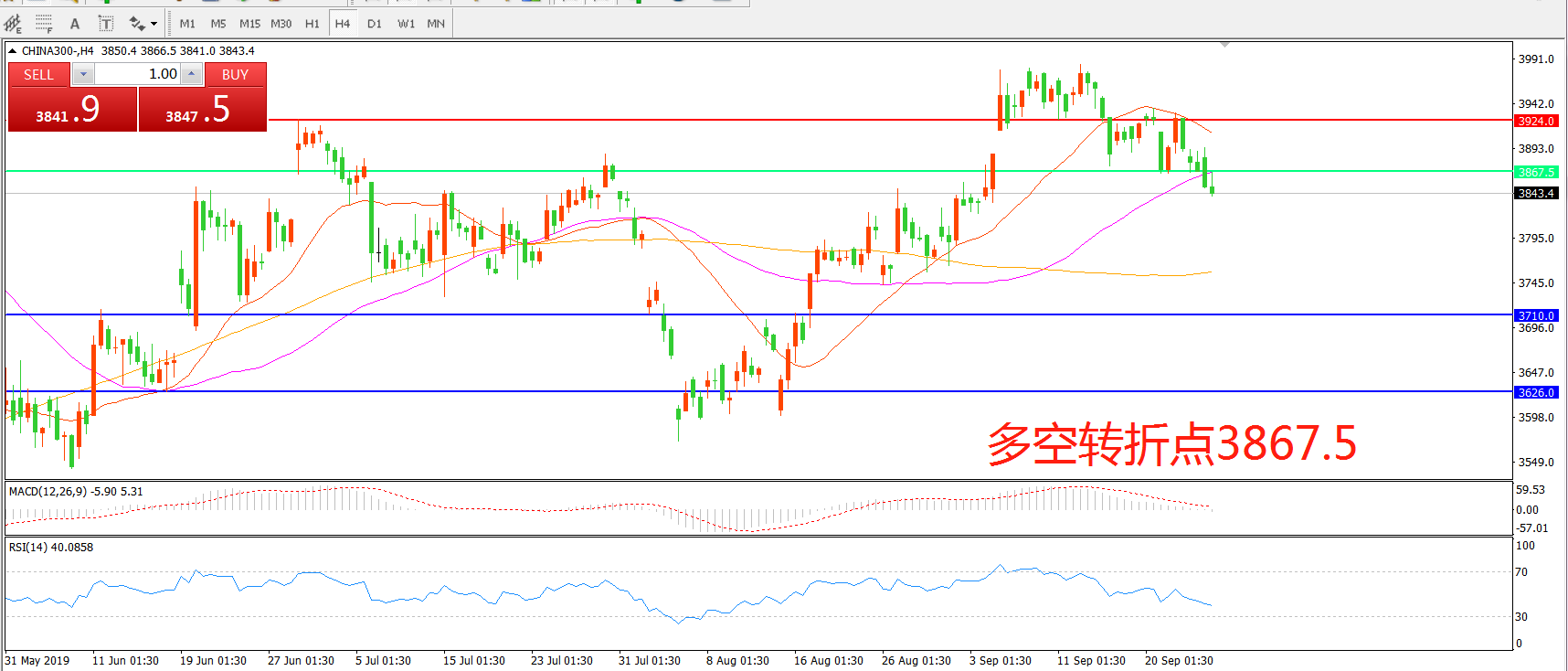 4小时图看,沪深300延续下行,3867.5被跌破后,整体走势偏弱,MACD红柱减少,RSI指标向下,日内依然有回落风险。