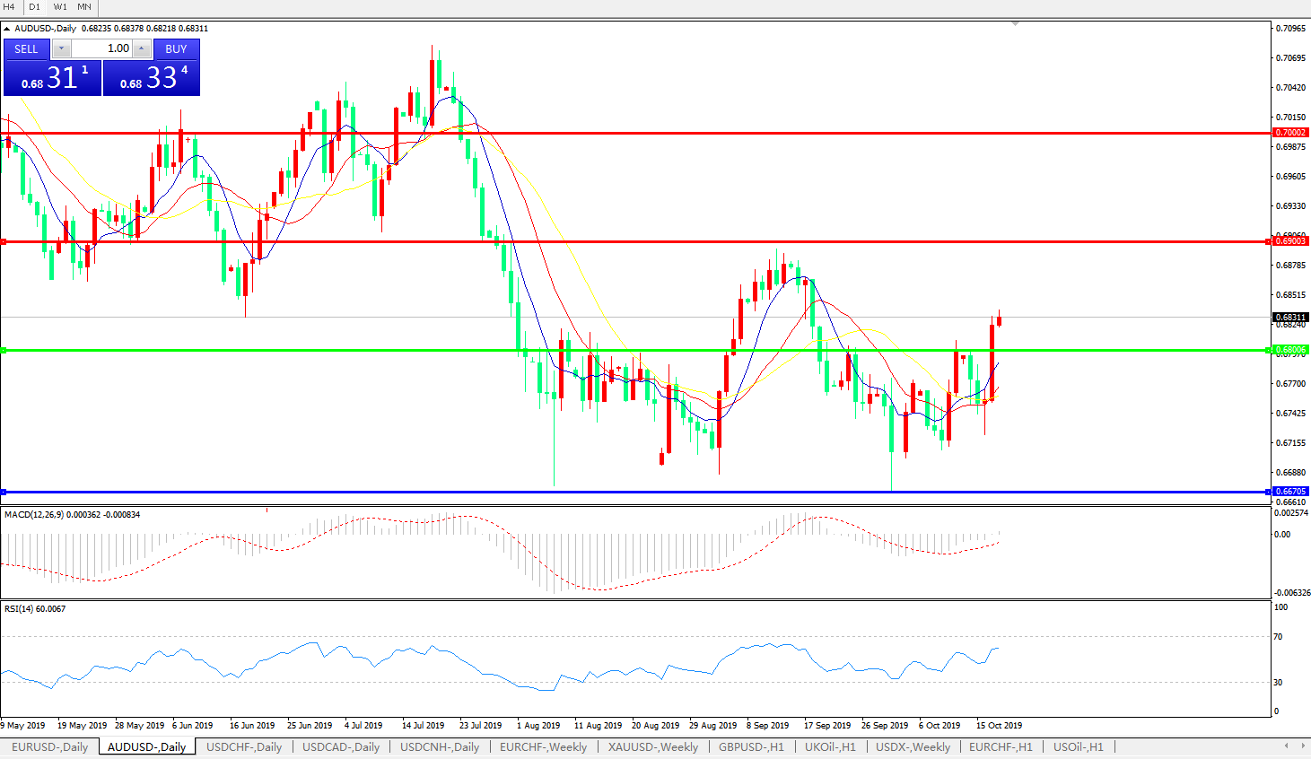 交易策略:0.6800上方看涨,目标0.6900、0.7000