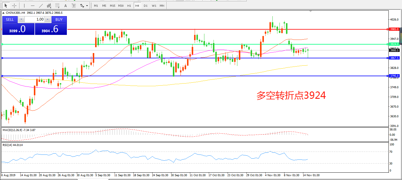 4小时图看,沪深300冲高回落,短期格局再次走向震荡,均线系统走平,MACD红柱减少,RSI指标向上,日内窄幅震荡的概率较大。