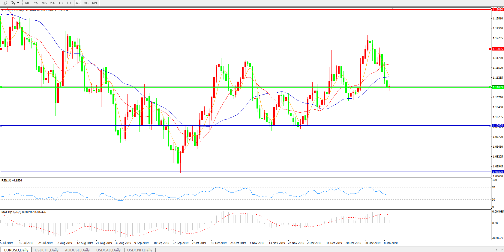 技术面简析:日图短期均线开始形成死叉,汇价延续近期弱势继续下行,目前徘徊于1.11关口,MACD开始下行且量能快速萎缩 ,RSI缓步走低,预计汇价大概率将弱势整理,重点关注下方1.11关口的支撑。