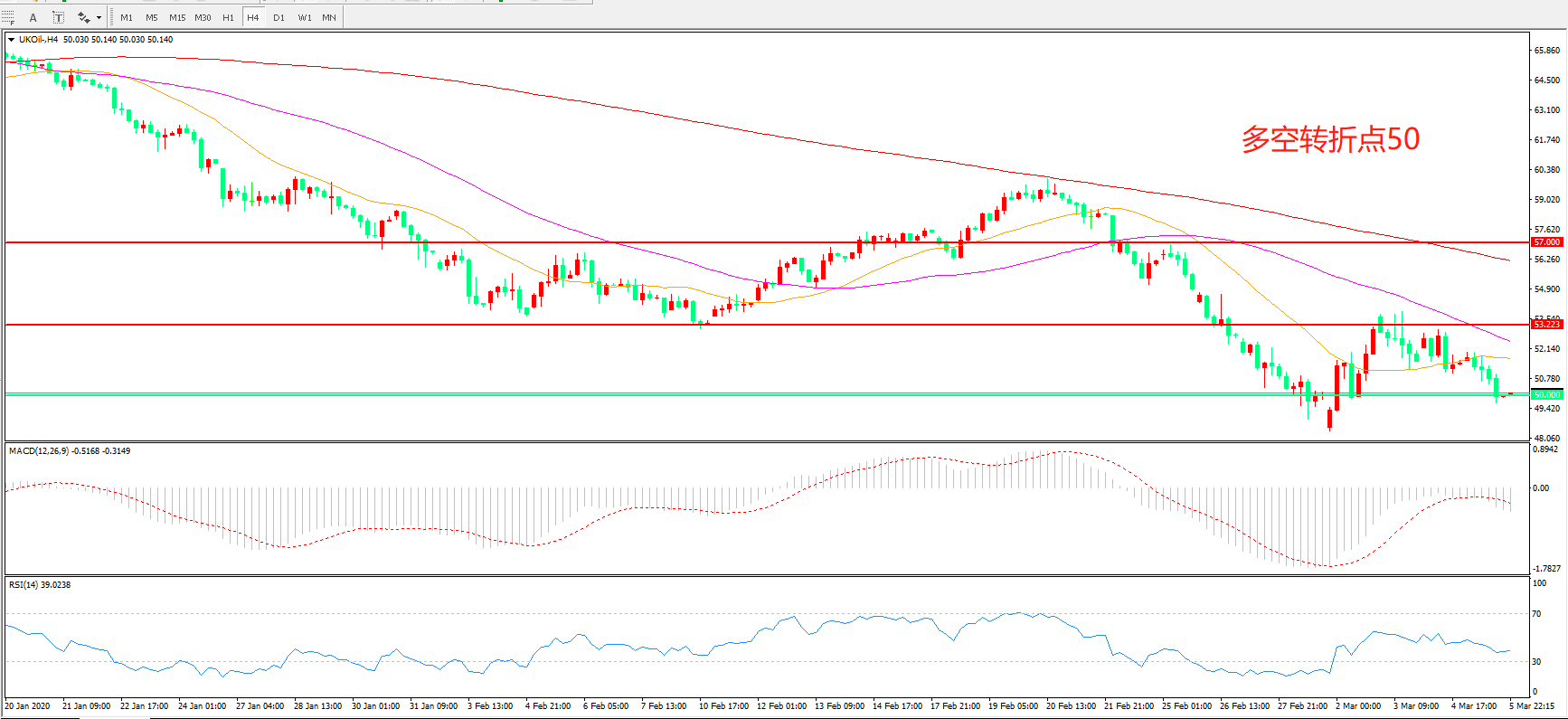 4小时图看,布油延续震荡下行,55周期均线成为上方阻力,整体表现低迷, MACD绿柱减少,RSI指标走平,重点关注50美元一线得失。