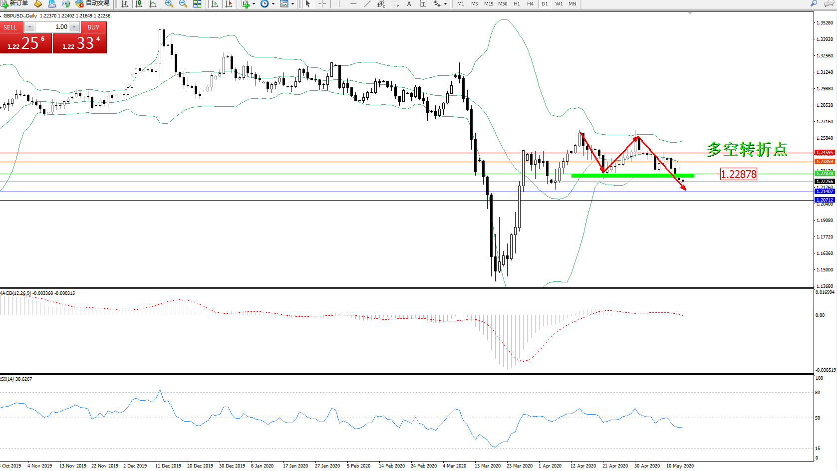 交易策略:1.22878下方看跌,目标1.21407、1.20712