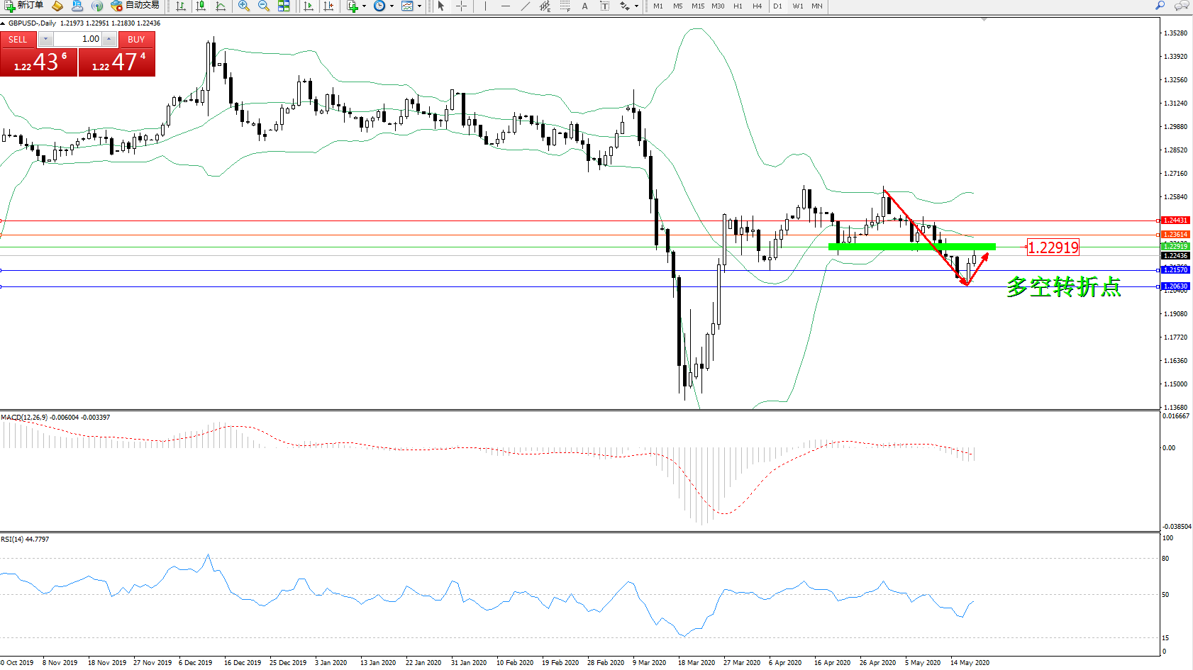 交易策略:1.22919下方看跌,目标1.21570、1.20630