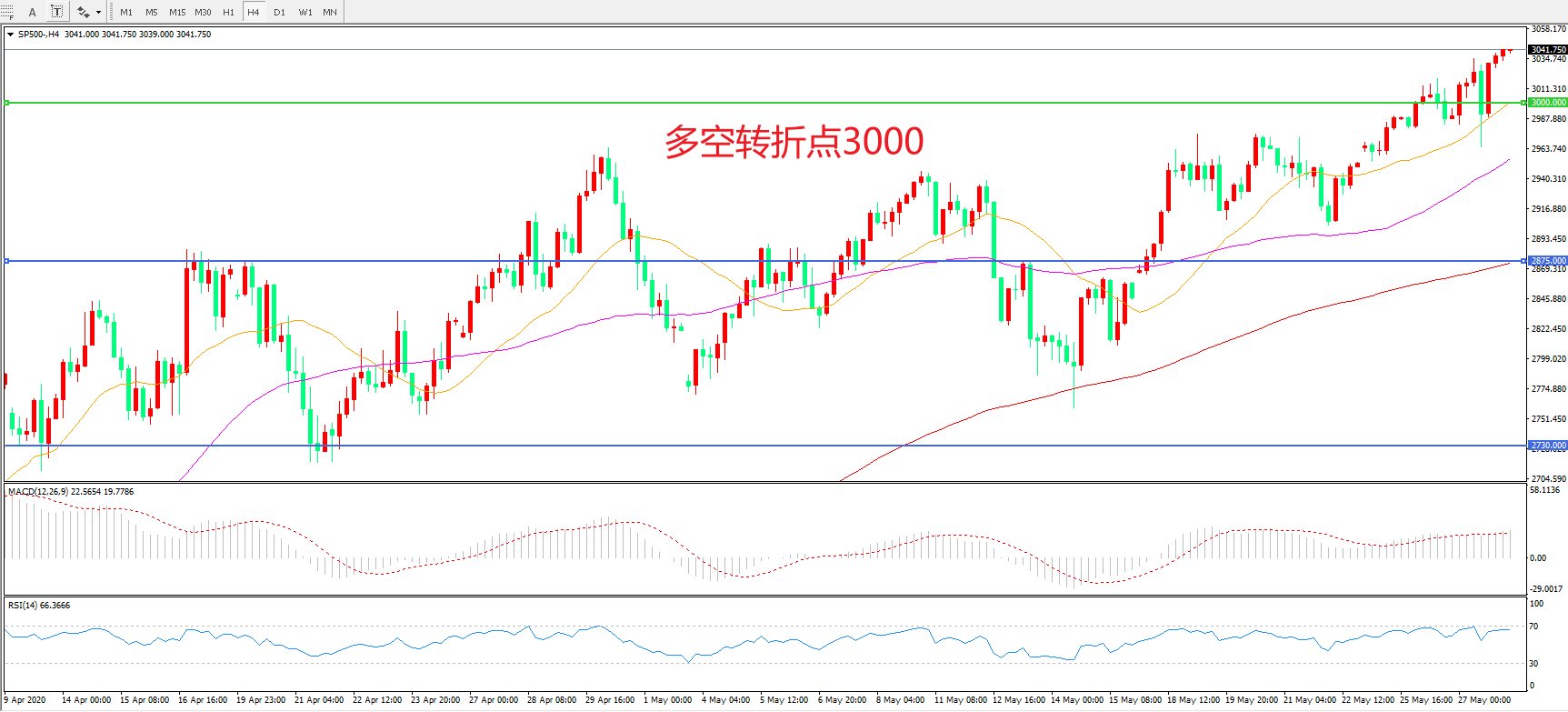 4小时图看,标普500高开高走,长阳拉升,整体表现十分强势,3000点成为短期支撑,均线系统呈多头排列,MACD红柱增加,RSI指标走平,日内延续上行概率较大。