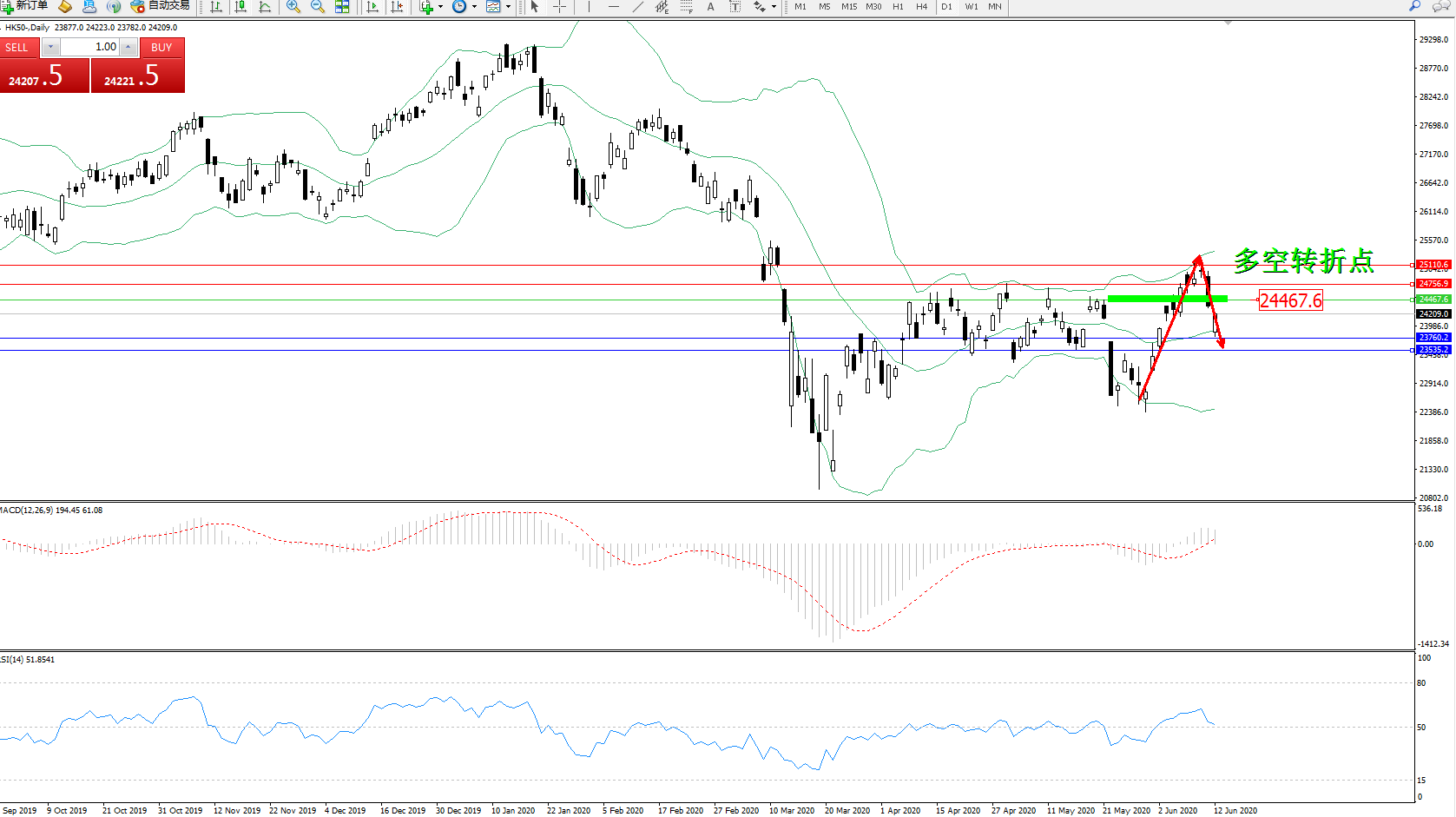 香港恒生指数612日(周五)收盘下跌178.77点,跌幅0.73%,报24301.38点;港股三大指数均收跌,恒指尾盘跌幅明显收窄,南下资金逆势净流入30.15亿港元,大市成交额为1154.38亿港元。盘面上,市场担忧美国可能出现第二波疫情,生物制药股与医疗设备股逆势领涨,亚盛医药飙涨17%,威高股份升超4%再创新高;美股创下12周来最大跌幅。本质上来说,这次的下跌就是因为涨幅过大引起的,领头羊纳指从底部上来也超过了40%,中间也有过几次下跌,美联储大力放水是关键因素,而昨日美联储的表态看上去也没有新招,总体市场对于放水这块的刺激在边际递减。