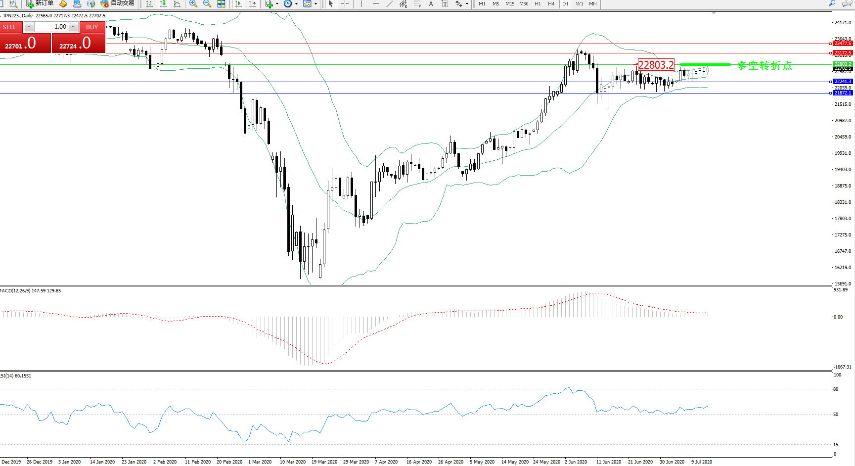 日经225指数7月14日(周二)收盘下跌215.24点,跌幅0.94%,报22569.50点。中国进出口数据整体向好,但不敌风险偏好情绪回落,亚洲股市大幅回落,近期美股、非美品种的同向波动需要出现变化,如果美国经济好转,将撤出部分为应对新冠疫情推出的刺激措施。由于本轮上涨行情已经在尾声阶段,因此上行的速度和力度都有了明显的放缓,这种情况下,市场会呈现涨三跌一甚至跌二的状况。持续的单边上涨或者下跌都不太可能出现。据日本广播协会(NHK)14日报道,为了放宽因为防范新冠疫情而采取的外国人入境限制措施,有消息显示日本政府正在研究以欧洲和美国等国的企业经营人等为对象,在时间短、人员少、且接受核酸(PCR)检测等的前提下,允许其入境日本。