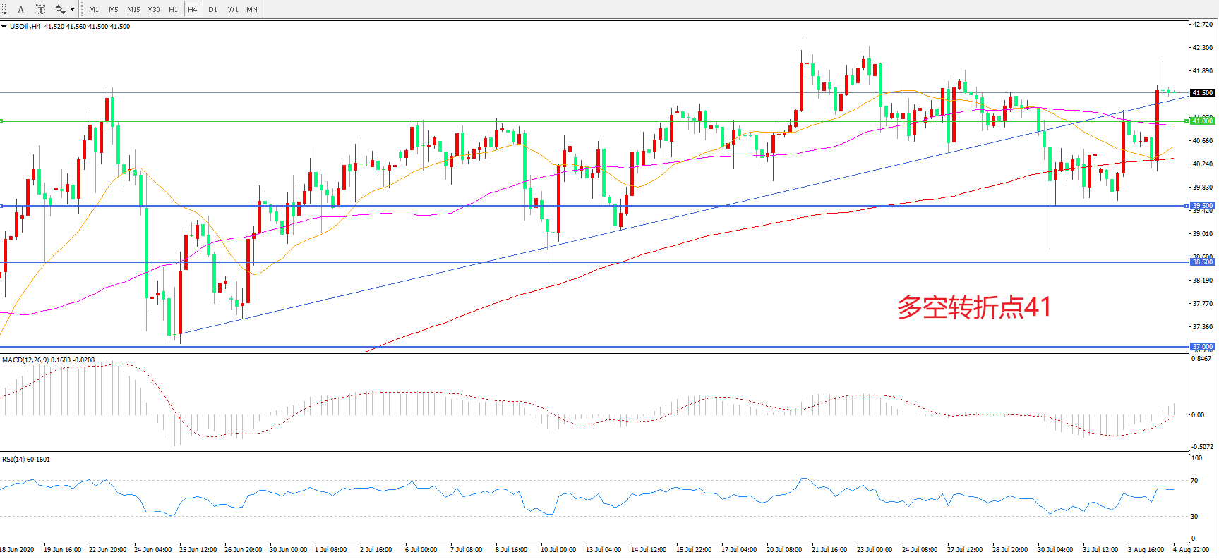周三(8月5日),美国石油协会公布的数据显示,当周API原油库存减少858.7万桶,大幅利好,数据公布后,美油短线走高,收报41.53美元/桶。美国新冠单日新增人数出现了大幅下滑,从疫情层面给到了价格的支撑,美国的刺激方案的谈判最近也朝着向好的迹象发展,原油价格有望迎来一波新的反弹。
