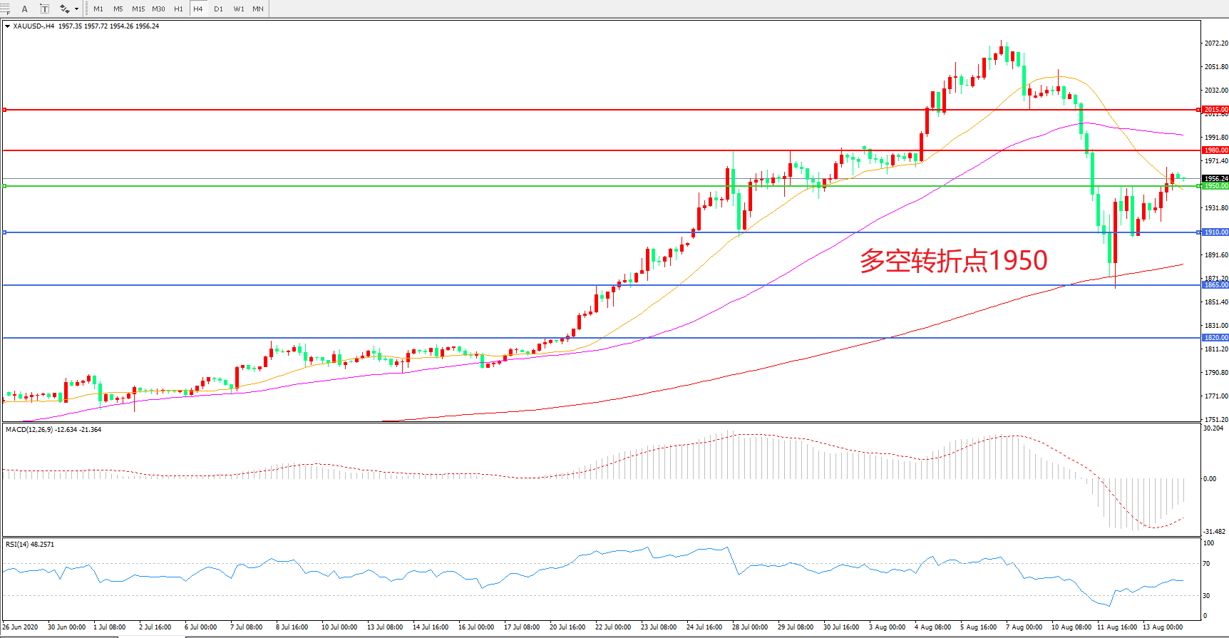 周四(8月13日),美元指数依旧弱势,美债收益率也高位回落,现货黄金自低位大幅反弹,收报1961.65美元/盎司。虽然美国上周初请失业金人数回到了100万以下,但依然有超过2800万失业者在领取救济金,反映出劳动力市场复苏步伐缓慢,进而提升了黄金的吸引力。