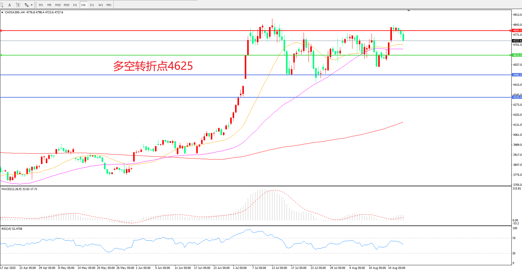 4小时图看,沪深300冲高回落,短期涨势暂缓,4800成为短期,均线系统成为短期支撑, MACD红柱增加,RSI指标向下,日内延续震荡概率较大。