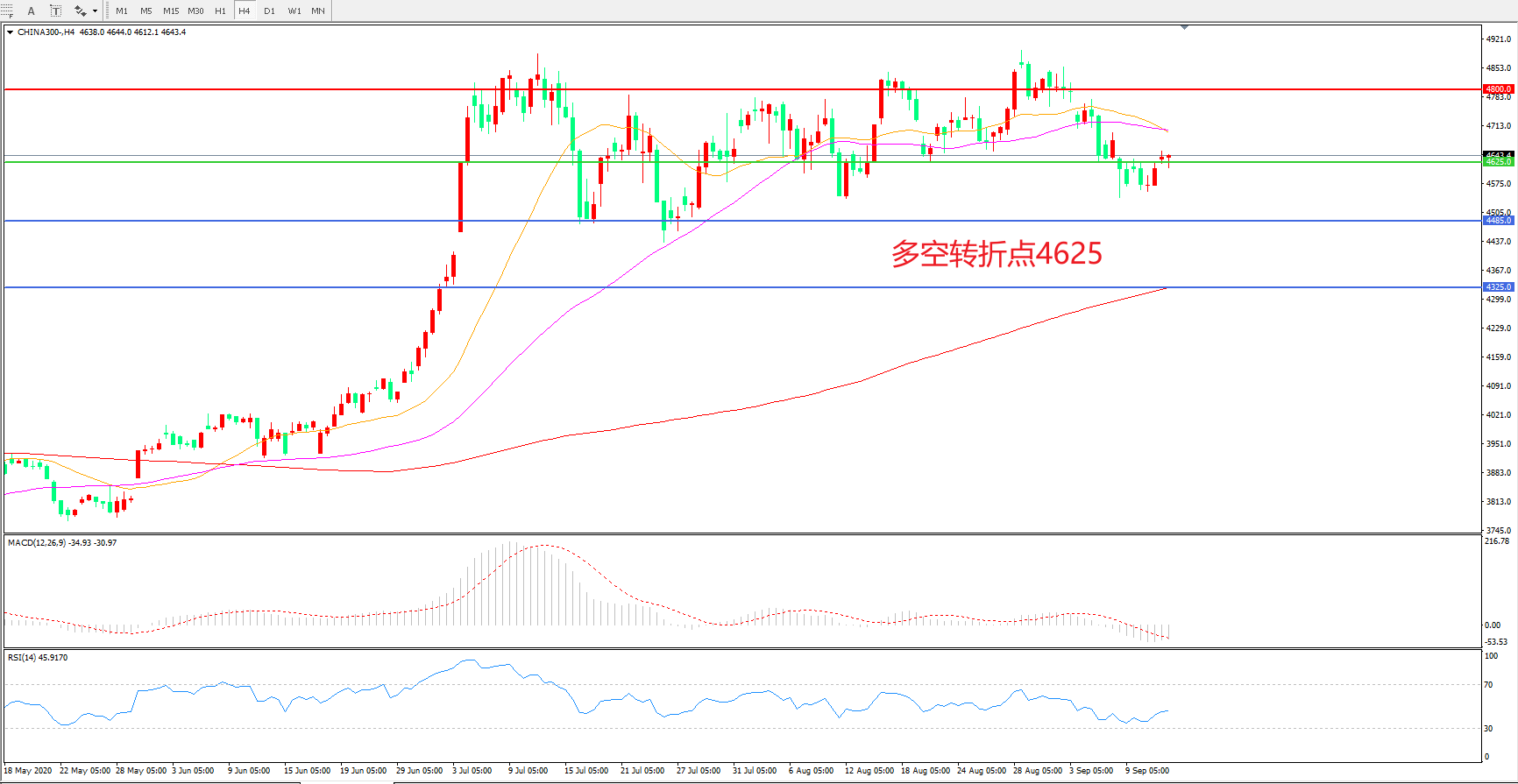 4小时图看,沪深300小幅反弹,短期走势有所回暖,4625成为短期多空分水岭,均线系统走平, MACD绿柱缩短,RSI指标向上,日内震荡上行概率较大。