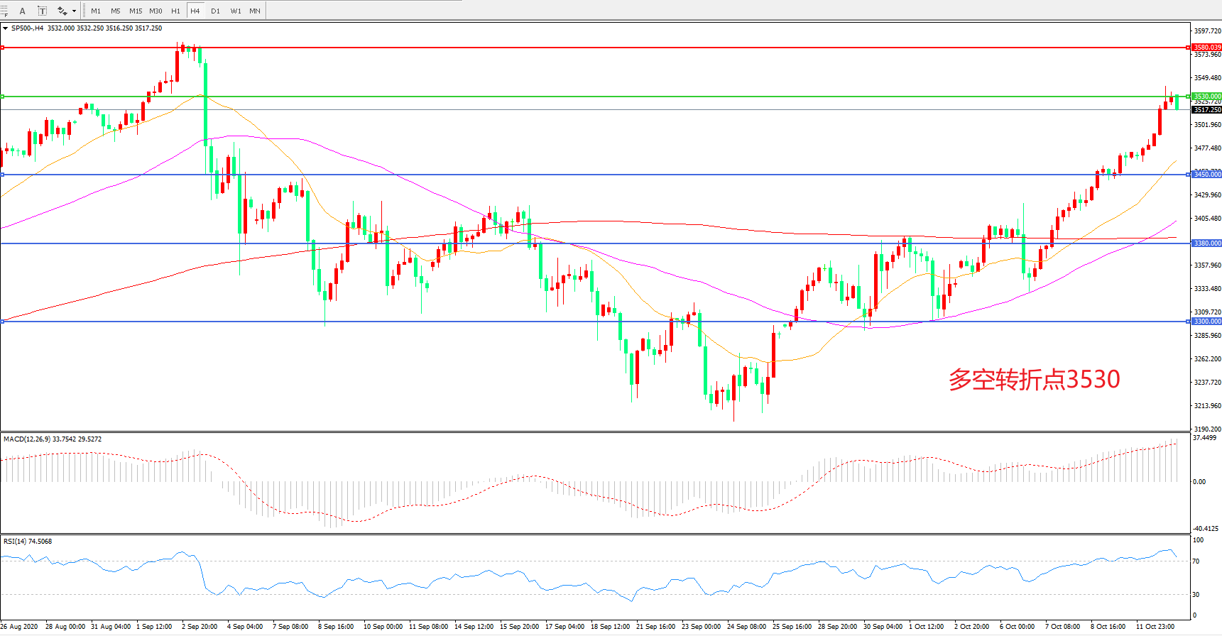 4小时图看,标普500连续拉升,整体走势偏强,短期均线呈多头排列,MACD红柱增加,RSI指标走平,日内延续上行概率较大。