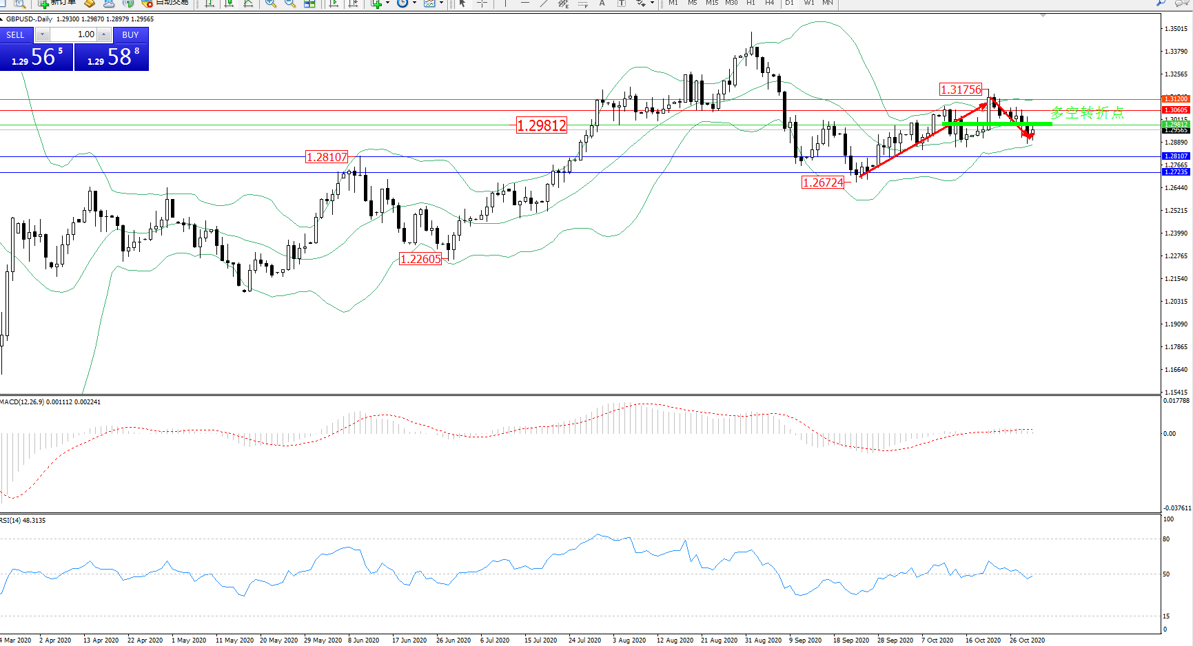 交易策略:1.29812下方看跌,目标1.28107、1.27235