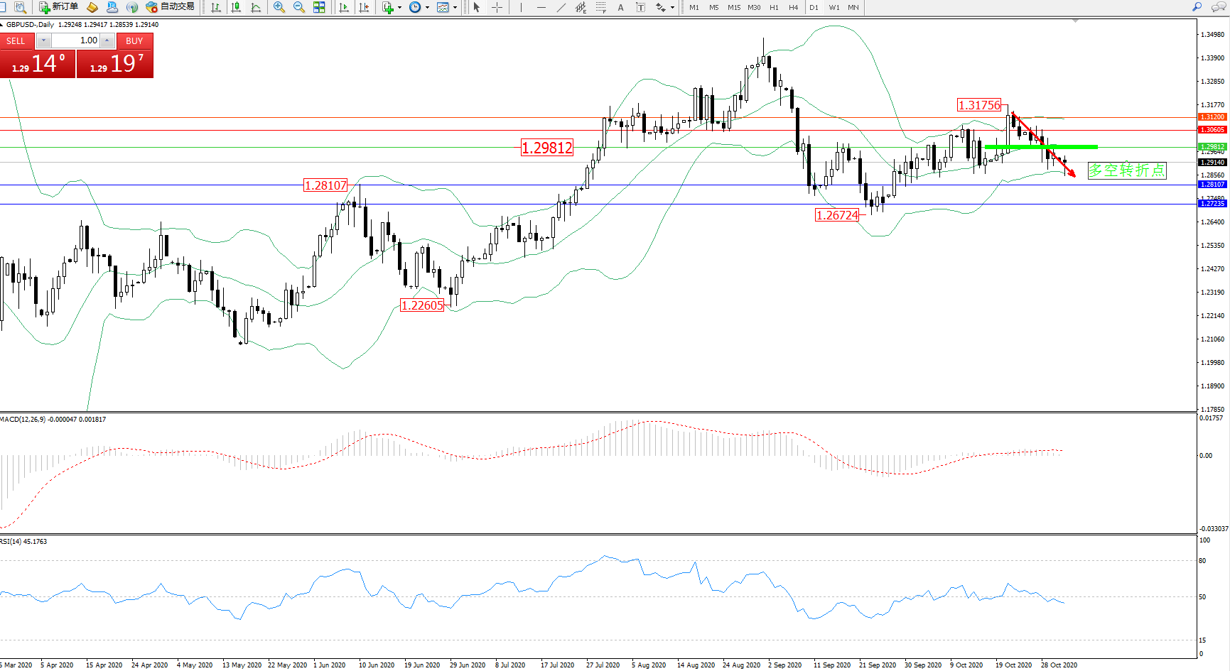 交易策略:1.29812下方看跌,目标1.28107、1.27235