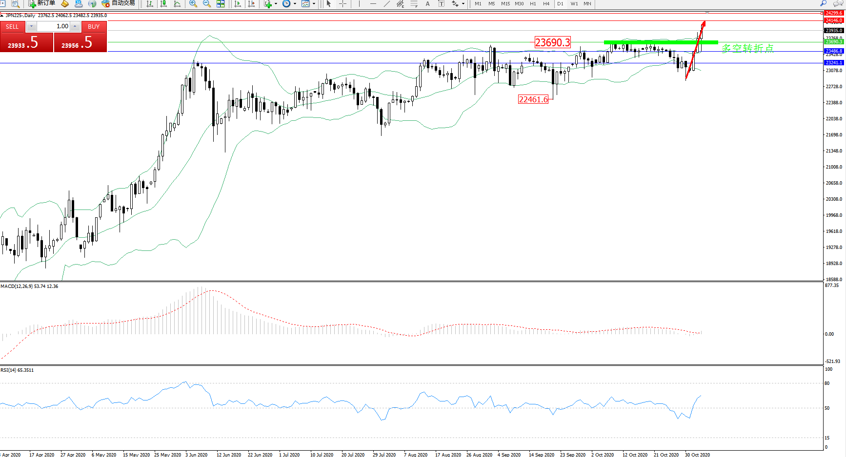 日经225指数11月4日(周三)收盘上涨435.02点,涨幅1.87%,报23730.50点。市场对特朗普胜选的预期不断升温,这令美元指数反弹至五周半高位,因此前市场一直对拜登胜选进行押注,因此美元不断走低,日本央行行长黑田东彦表示,病毒对经济影响的不确定性高,如有必要将毫不犹豫的加码宽松,重要的是要创造一个环境,使受到大流行冲击的企业不会陷入现金短缺,顺利恢复运营。日本央行会议纪要显示:委员们一致认为,全球金融市场紧张局势有所缓解,但股市波动仍保持在相对较高水平,新冠疫情造成的后果及其对国内外经济的影响程度仍存在极大的不确定性。一位委员表示,目前货币政策的首要任务是支持企业融资、维持就业,日本央行应进一步研究其新冠疫情期间的货币政策行动,如有需要,将毫不犹豫增大宽松力度。