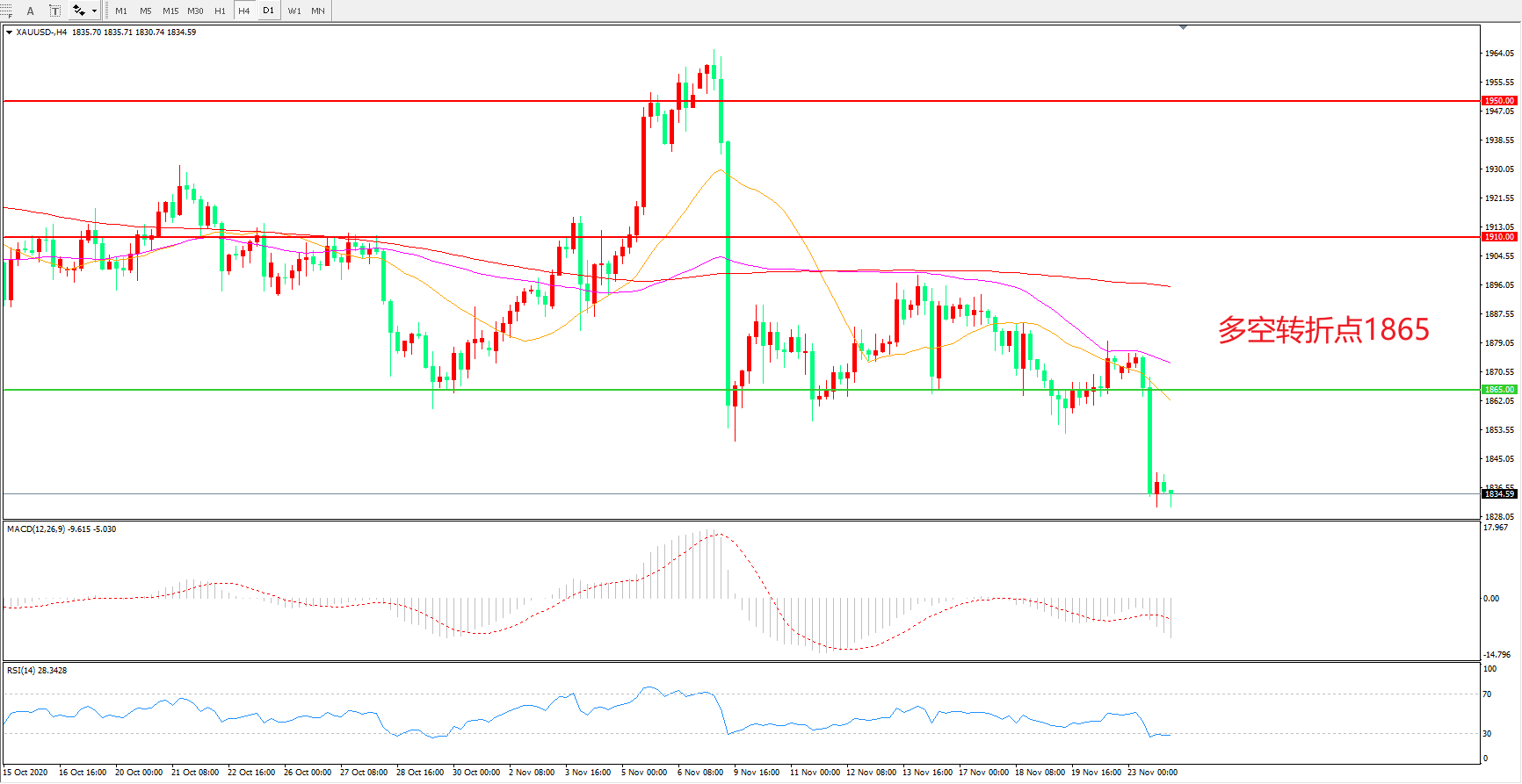 周一(11月24日),受疫苗利好消息和美国经济数据影响,现货黄金再次遭遇重挫,日内小幅反弹后一度较日高跌逾40美元,收报1832.92美元/盎司。在风险情绪回升的情况下,金价将持续受到打压,目前下方关键支撑在1815美元/盎司,一旦跌破则意味着短期进一步走低。