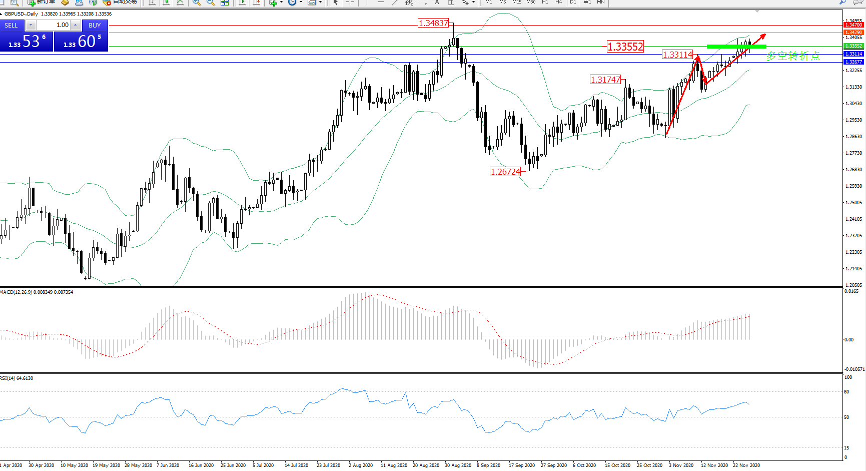 交易策略:1.33552上方看涨,目标1.34290、1.34700