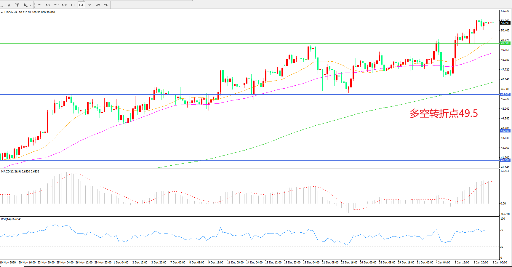 周四(1月7日),美国国会确认,拜登获得当选总统所需的270张选举人票,当选美国第46任总统,特朗普发表声明称,尽管完全不同意选举结果,但1月20日将会“有序”过渡。市场风险情绪回暖,美国WTI原油一度冲破51美元整数位,刷新2020年2月中旬以来的11个月新高,,收报51.01美元/桶。