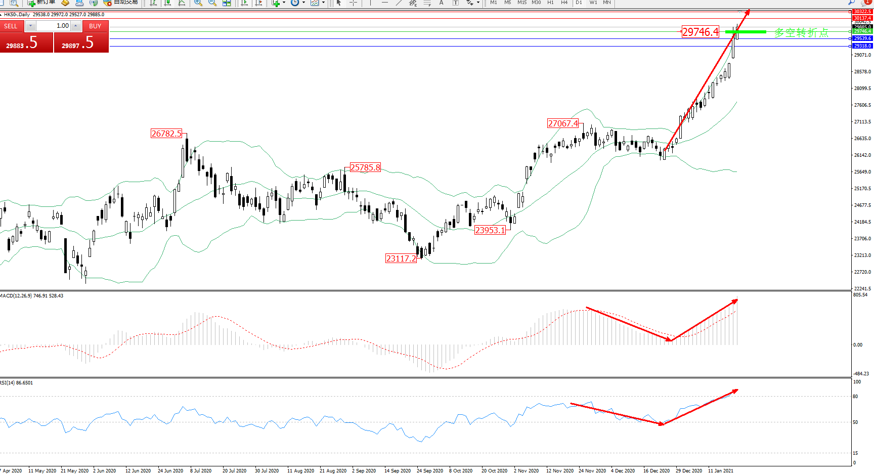 技术点评:多头动力延续布林带指标通道上轨附近持续震荡上扬态势良好,强势飙升后屡破新高,布林带指标呈张口走势持续中,多头动力未见其止步迹象,且有继续拉升上扬态势,MACD指标处于多头区域维持震荡上扬态势良好,RSI指标处于多头区域维持震荡上扬至80均衡线上方持续拉升中;